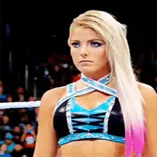 Mulher loira com cabelo longo e rosa, vestindo top preto e azul, em um ringue de luta.