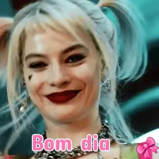 Uma mulher com cabelo loiro e penteado em duas pontas sorri com os dizeres 'Bom dia' em rosa.