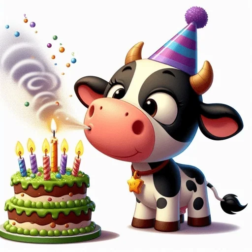 Vaca cartoon usando chapéu de festa e apagando velas de um bolo de aniversário com confetes.