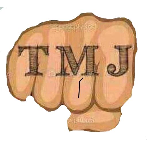 Um punho cerrado com as letras 'TMJ' em preto, estilo cartoon.