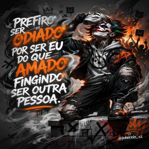Personagem do Coringa com frase 'Prefiro ser odiado por ser eu do que amado fingindo ser outra pessoa.' em destaque, com fundo de fogo e fumaça.