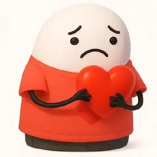 Um ovo antropomórfico com expressão de descontentamento, vestindo uma camisa laranja, segura um coração vermelho. O ovo tem sobrancelhas franzidas e uma boca triste.