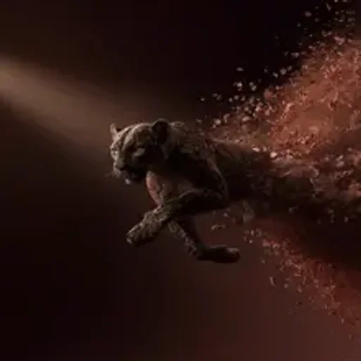 Um tigre preto em movimento, com partes do corpo se desintegrando em pedaços vermelhos, em um fundo escuro com luz…