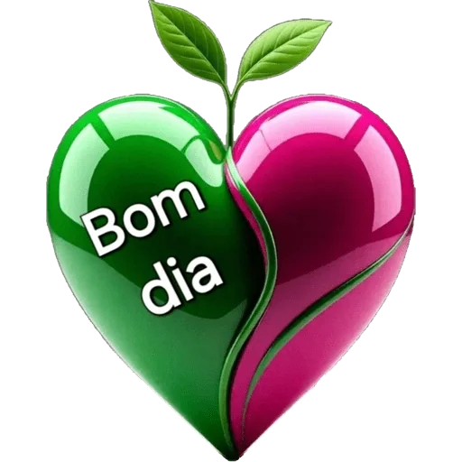 Um coração verde e rosa com uma plantinha brotando em cima, com o texto 'Bom dia' em branco.