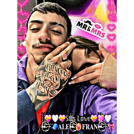 Um casal se beijando, com o homem tendo uma tatuagem na mão e um texto 'MR&MRS' e 'Stays Love ALE FRAN' no fundo, rodeado de corações.