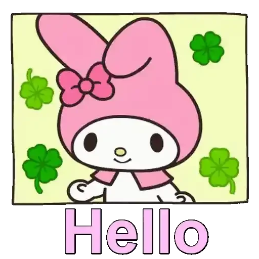 Um personagem de desenho animado com orelhas de coelho rosa e um laço, com a palavra 'Hello' em letras rosa. O fundo é amarelo com trevos verdes.