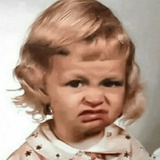 Rosto de uma criança com expressão de desaprovação ou irritação, com cabelo loiro e um fundo cinza.