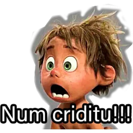 Menino de olhos arregalados e boca aberta, com texto 'Num criditu!!!'. Cabelo castanho e expressão de surpresa.