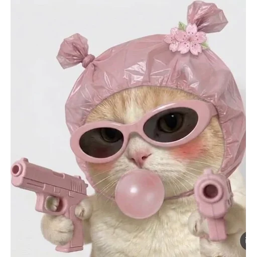 Gatinho com óculos de sol rosa, touca rosa com laços e flores, segurando duas pistolas e fazendo uma bolha de sabão.