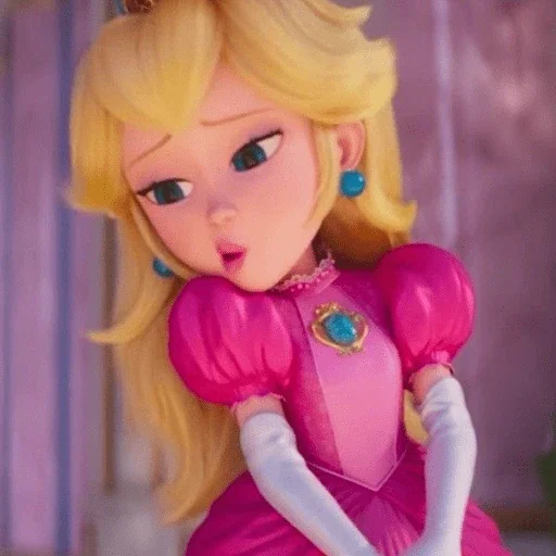 Princesa Peach com expressão de desaprovação, vestindo um vestido rosa e joias azuis.