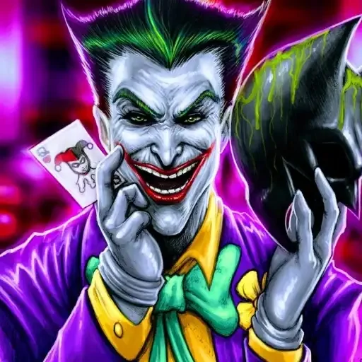 O Coringa, com sua icônica maquiagem branca e sobrancelhas verdes, segura um cartão e uma máscara preta com detalhes verdes, vestindo uma roupa roxa com colarinho e punhos amarelos e uma gravata verde.