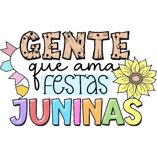 Uma ilustração colorida com o texto 'GENTE que ama FESTAS JUNINAS' e decorações de festa junina, incluindo uma flor de girassol e lanternas.