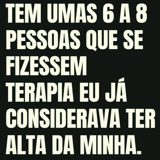 Um texto em branco sobre fundo preto. A frase 'TEM UMAS 6 A 8 PESSOAS QUE SE FIZESSEM TERAPIA EU JÁ CONSIDERAVA TER ALTA DA MINHA.' aparece em letras maiúsculas e brancas.