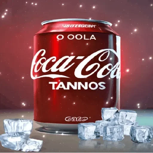 Uma lata de refrigerante Coca-Cola com o texto 'TANNOS' embaixo da logo, rodeada de gelo e faíscas.