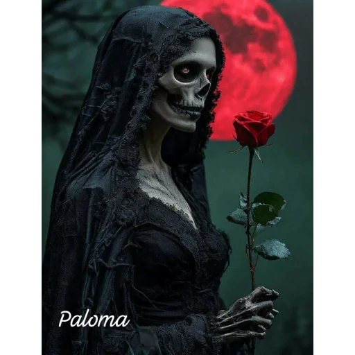 Uma mulher com uma caveira e um véu preto segurando uma rosa vermelha em frente à uma lua cheia vermelha, com o nome 'Paloma' no canto inferior esquerdo.