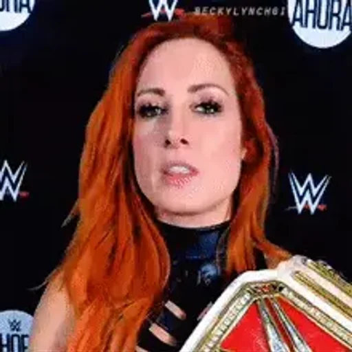 Mulher ruiva com expressão séria, segurando um cinturão de wrestling, contra um fundo preto com logotipos da WWE.