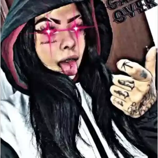 Uma mulher com cabelos pretos e capuz, maquiagem rosa nos olhos e língua para fora, com tatuagens nas mãos.