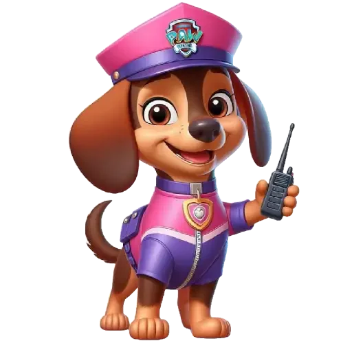 Um cachorro marrom com orelhas grandes e um uniforme rosa e roxo, com um chapéu de polícia, segurando um rádio.