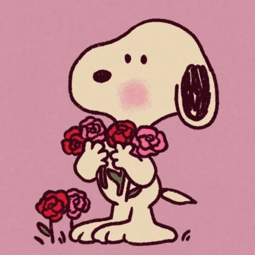 Snoopy segurando flores rosadas e vermelhas, com um fundo rosa. Ele tem uma expressão fofa e as flores estão próximas ao seu focinho.