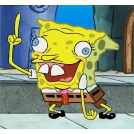 SpongeBob com expressão de surpresa e um dedo levantado, mostrando os dentes.