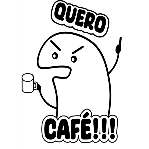 Um desenho de um personagem com cara de sono e um café na mão, com as palavras 'QUERO CAFÉ!!!' em destaque. O personagem parece sonolento e irritado.