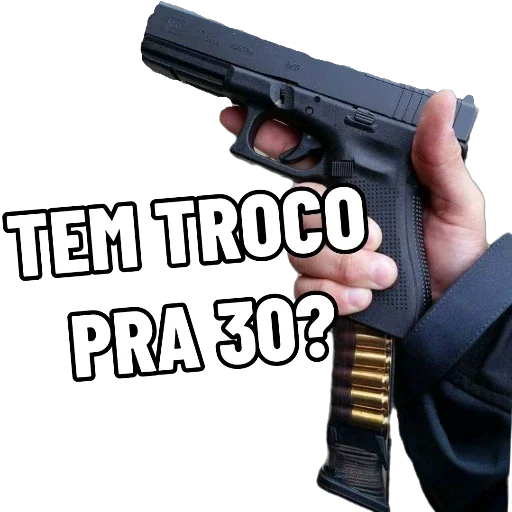 Uma mão segura uma arma de fogo preta com um carregador amarelo, com o texto 'TEM TROCO PRA 30?' em letras brancas com contorno preto.