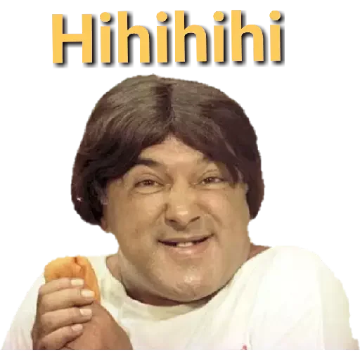 Uma mulher com um sorriso largo e olhos semicerrados, segurando um pedaço de pão, com a palavra 'Hihihihi' acima dela.