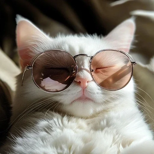 Gato branco usando óculos de sol com lentes escuras, parecendo relaxado.