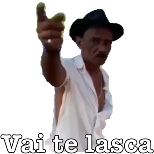 Homem de camisa branca e chapéu preto aponta o dedo indicador enquanto outro dedo fica levantado, com o texto 'Vai te lasca' na parte inferior.