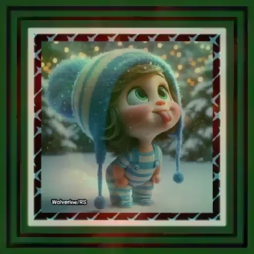 Menina fofa com chapéu de neve e roupa listrada, olhando para cima com expressão feliz, em um cenário invernal com luzes.