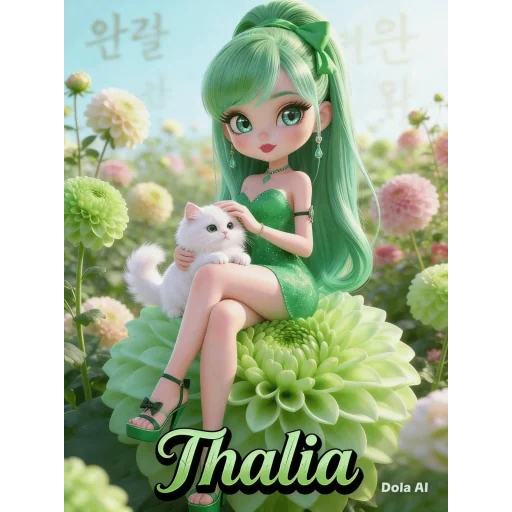 Uma menina de cabelo verde longo sentada em uma flor grande com um gato branco no colo. Ela está usando um vestido verde e sandálias. O fundo é um jardim com flores coloridas.