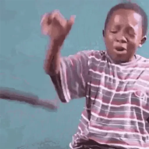 Menino com camisa listrada rosa e branca fazendo um gesto com a mão esquerda, fundo azul.