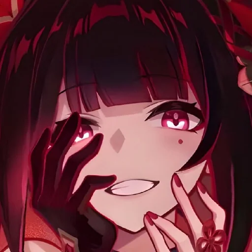 Garota de anime com cabelos pretos e olhos vermelhos, mãos no rosto e expressão surpresa ou assustada.