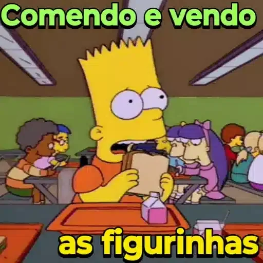 Personagem Bart Simpson comendo e olhando para as figurinhas, com texto 'Comendo e vendo as figurinhas'.