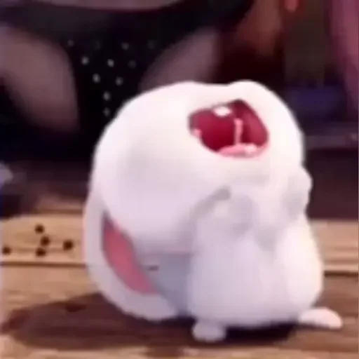 Um ursinho branco e fofo com a boca aberta em choque ou surpresa, sentado em uma superfície de madeira.