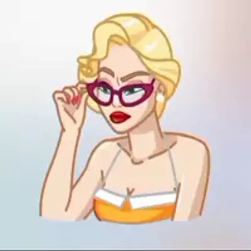 Uma mulher loira com óculos de sol rosa e um busto laranja e branco olha para o lado com a mão no rosto.
