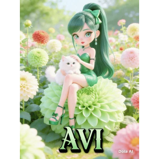 Uma menina de cabelo verde longo sentada em uma flor grande com um cachorro branco no colo, em um jardim colorido. Ela usa um vestido verde e sapatos de salto.