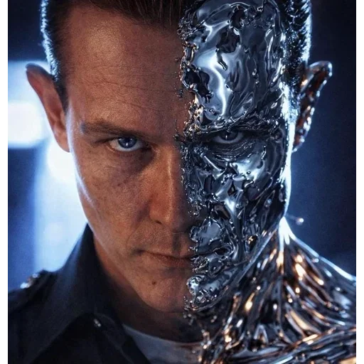 Um homem com metade do rosto humano e a outra metade metálica e robótica, com uma expressão séria e sombria.