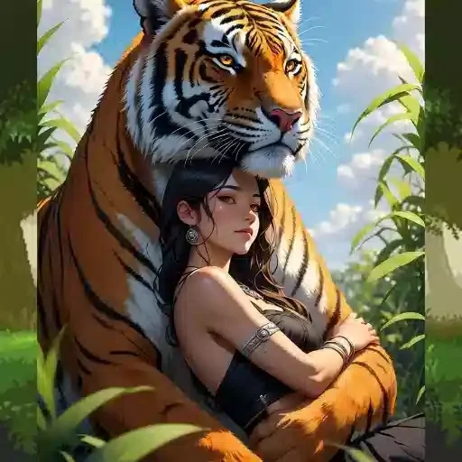 Uma mulher de cabelo preto e um top preto é abraçada por um tigre laranja e branco em um ambiente natural com plantas e céu azul.