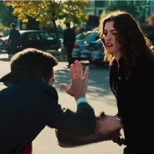 Cena de filme com homem e mulher em pé, em via pública, com as mãos afastando-se.