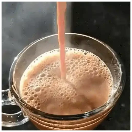 Um copo de bebida quente, provavelmente chocolate ou café com leite, com espuma e vapor saindo dele.