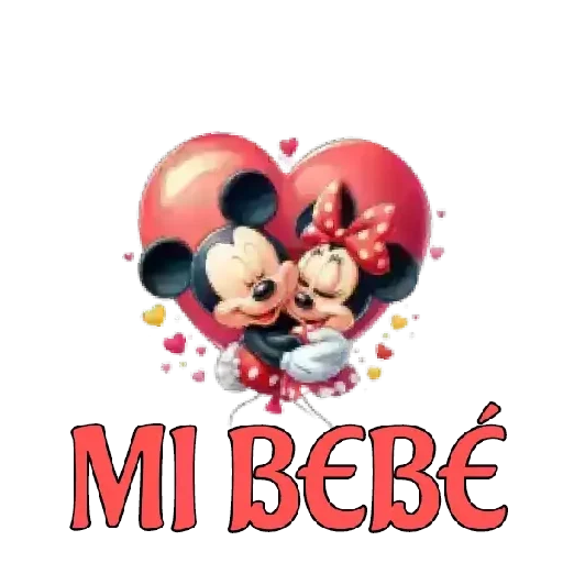 Mickey e Minnie Mouse se beijando dentro de um coração vermelho gigante, com balões e corações ao redor. Abaixo deles, está escrito 'MI BEBÉ' em letras vermelhas.
