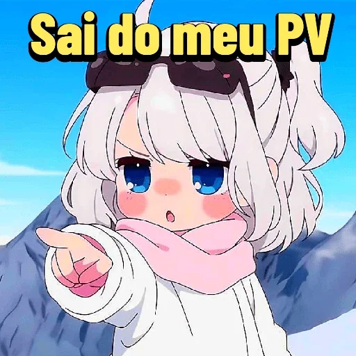 Uma garota de anime com cabelo branco e óculos de sol aponta o dedo enquanto diz 'Sai do meu PV'. Ela tem um cachecol rosa e um suéter branco.