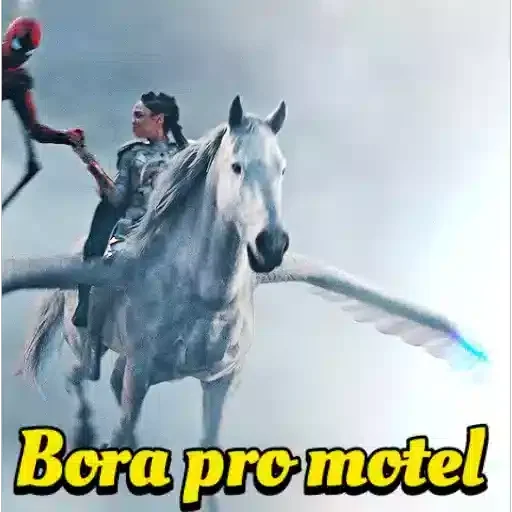 Um homem com cabelos pretos e uma capa está montado em um cavalo cinza com asas, sendo puxado por uma figura sombria com uma máscara vermelha. Abaixo, está escrito 'Bora pro motel'.