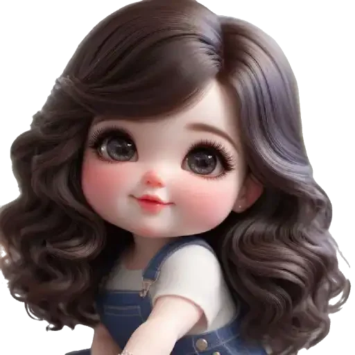 Menina com cabelo castanho ondulado e macio, vestindo um macacão azul e uma blusa branca, com bochechas rosadas e olhos castanhos grandes.