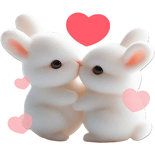 Dois coelhos brancos se beijando, com um coração vermelho acima e pequenos corações rosa ao redor.