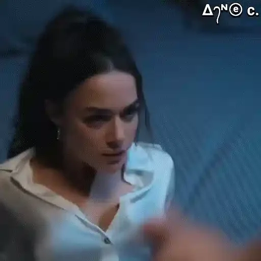 Mulher com expressão séria e cabelo escuro, vestindo uma blusa branca, olhando para baixo com uma mão levantada.