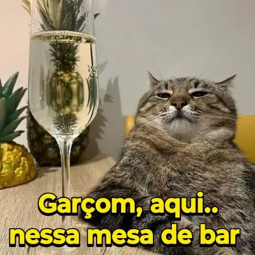 Gato marrom com expressão relaxada ao lado de um abacaxi e uma taça de vinho, com o texto 'Garçom, aqui.. nessa mesa de bar'.