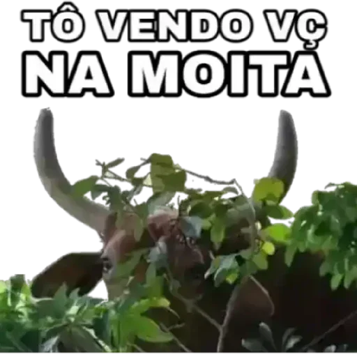 Um boi com chifres grandes e folhas verdes ao redor, com o texto 'TÔ VENDO VC NA MOITA' em letras grandes.