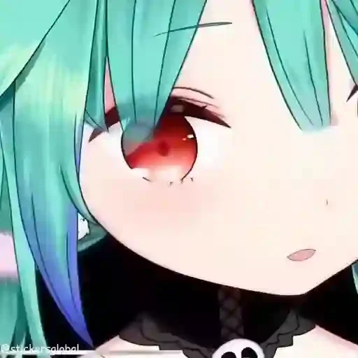 Personagem de anime com cabelo verde-azulado e um olho vermelho brilhante, parecendo surpresa ou confusa.